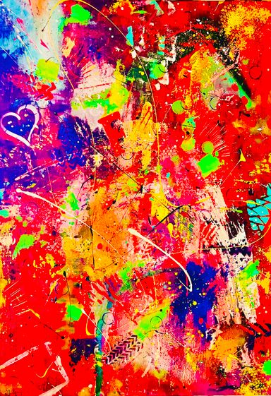 Dieses Objekt ist ein abstraktes Kunstwerk mit lebendiger, energetischer Farbgebung und dynamischer Komposition.