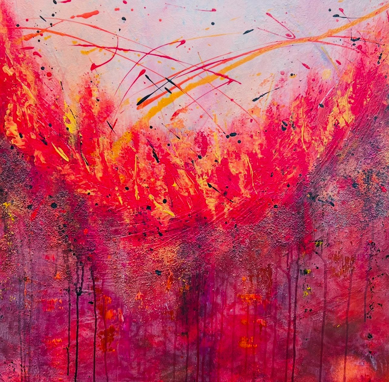 Das Zusammenspiel von expressiver Farbgewalt und fließender Struktur lässt das Bild leidenschaftlich und zugleich verletzlich wirken.