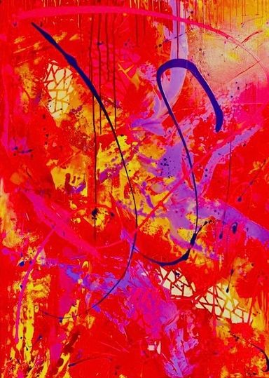 Ein explosiver Farbenrausch: Rot dominiert, während Violett, Gelb und tiefes Blau wie energische Blitze durchs Bild jagen.