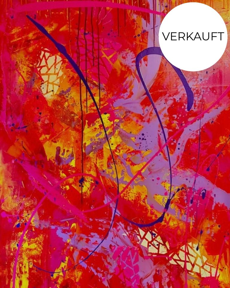 Das Bild zeigt ein lebhaftes, abstraktes Gemälde mit einer sehr intensiven und warmen Farbwirkung, die an Klängen erinnern. Dominierend sind kräftige Rot-Pink- und Orangetöne, die durch leuchtendes Gelb und Akzente in Violett und Blau ergänzt werden. Die Farben sind in mehreren Schichten aufgetragen und teilweise verlaufen oder gespritzt, wodurch eine dynamische, energiegeladene Bildwirkung entsteht.