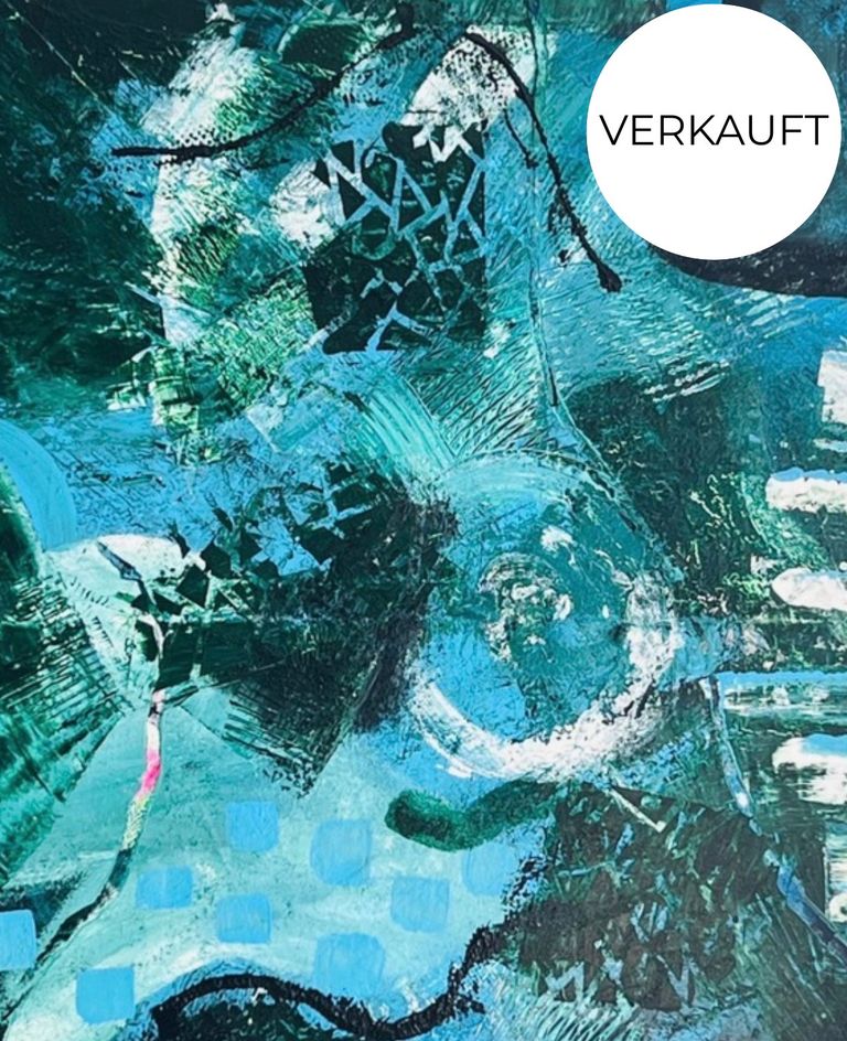 Es gibt dynamische Pinselstriche und dichte Farbschichten, die Tiefe und Bewegung erzeugen. Schwarze Linien und geometrische Formen, wie Dreiecke und Rechtecke, fügen eine scharfe, fast grafische Dimension hinzu. Inmitten der harmonischen Blau-Grün Komposition leuchten weiße Flächen, die Kontraste setzen und dem Bild eine gewisse Struktur verleihen. Ein kkeiner Akzent in Rosa im unteren Bereich bricht die kühlen Farben auf und sorgt für eine interessante visuelle Überraschung.