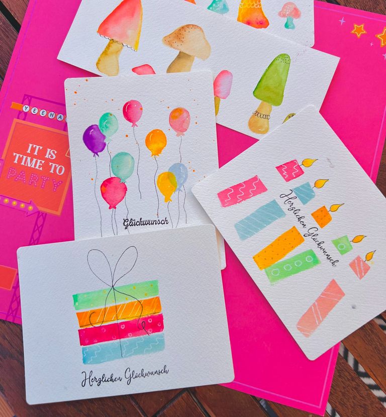 mit dem Thema : Wir gestalten Geburtstagskarten in Aquarell, mit Pilzen, Luftballons, Kerzen u.v.m.